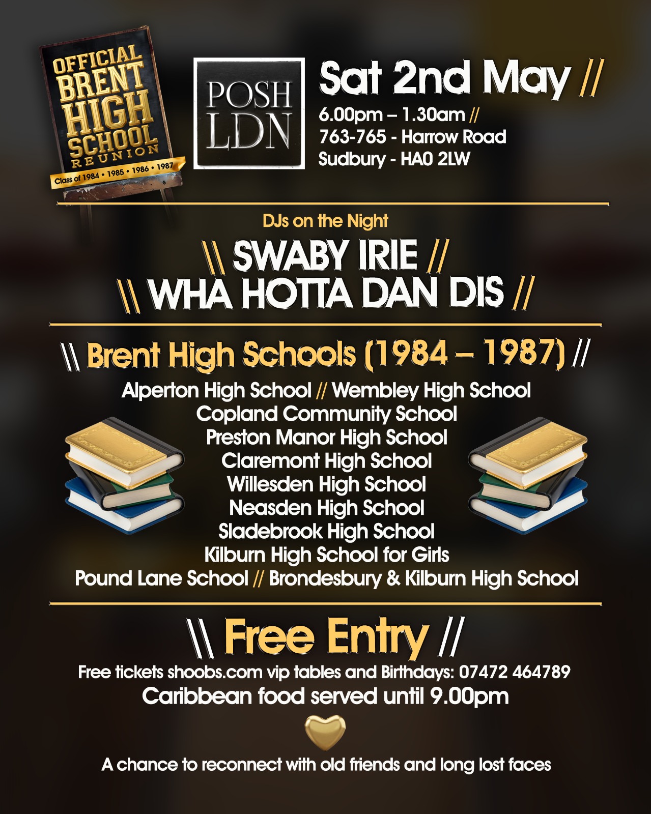 โจ OFFICIAL BRENT HIGH SCHOOL REUNION 1984โ1987 โจ ๐๐ A night to reconnect with old friends & longโlost faces ๐๐ ๐ฅ Saturday 2nd May โฐ 6:00 PM โ 1:30 AM ๐ POSH LDN โ 763โ765 Harrow Road, Sudbu...
