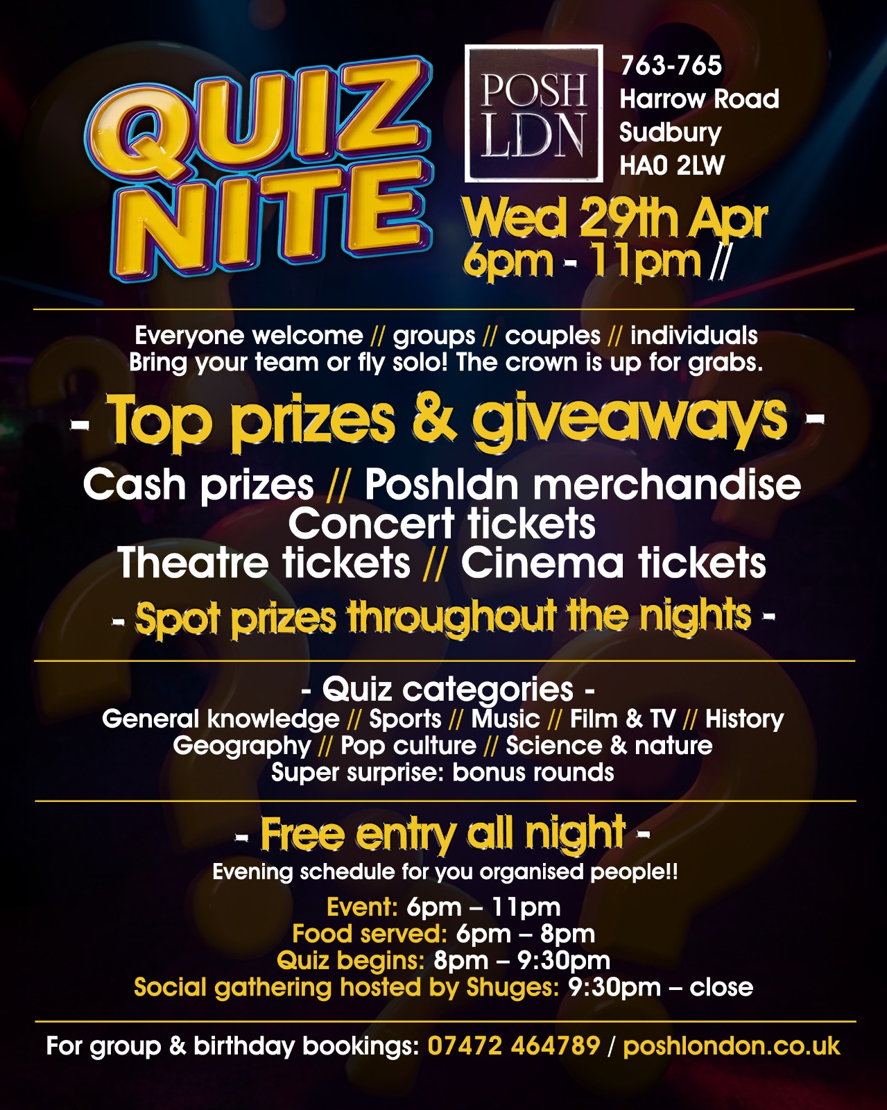 🔥 QUIZ NITE AT POSH LDN 🔥 Hosted by the one & only Shuges the Quiz Master 🎤🧠✨ 💥 WHAT’S GOING DOWN 💥 👥 Everyone welcome — groups, couples, individuals 👑 Bring your team or fly solo — the c...